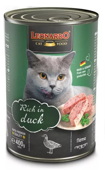LEONARDO® Quality Selection es un alimento húmedo indicado para gatos adultos rico en Pato. En su fórmula solamente se utilizan productos cárnicos frescos
